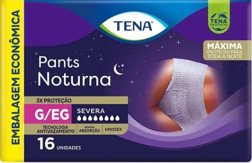 A linha de fralda descartável geriátrica Tena Pants Noturna é modelo roupa íntima, estilo fralda calça foi desenvolvida para incontinência urinária severa.